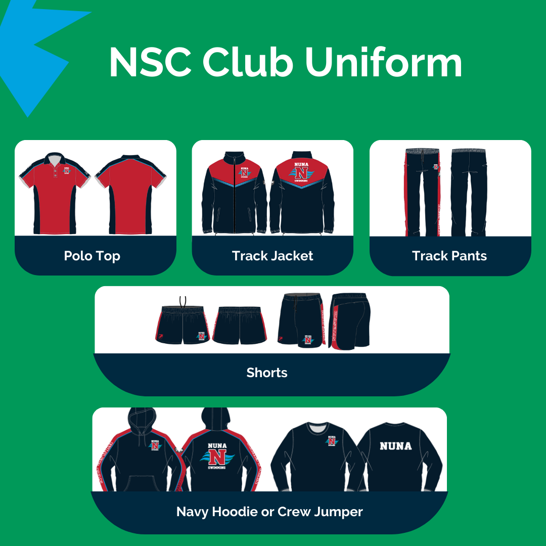 The Nunawading Swimming Club uniform consists of a polo shirt, shorts tracksuit jacket, pants and a swim cap plus the navy hoodie or navy crew jumper. The uniform is to be worn at all swim meets where swimmers are representing the club, from local and State level meets through to Australian Age and Open Championships / Trials.